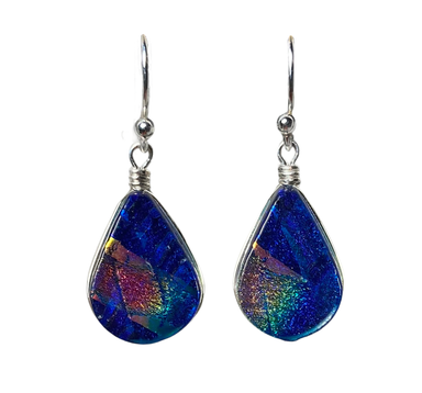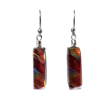 These fused glass earrings were created using dichroic glass made with vaporized metal oxides. The colors in the glass are produced from light bent...