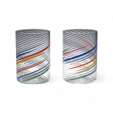 Swirls of glass cane create colorful rainbows in this blown glass tumbler. Perfect for everyday use, and a great way to add a festive flair to your...