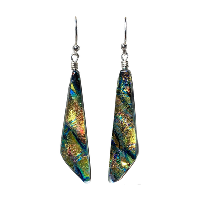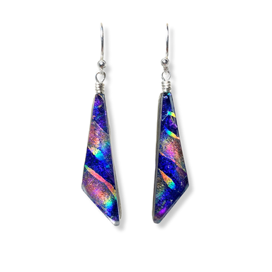 These fused glass earrings were created using dichroic glass made with vaporized metal oxides. The colors in the glass are produced from light bent...