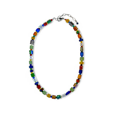 This necklace is a joyful blend of vibrant color and artisan skill. Each glass bead—emerald, sapphire, amber, violet, and more—is handmade by Lisa ...