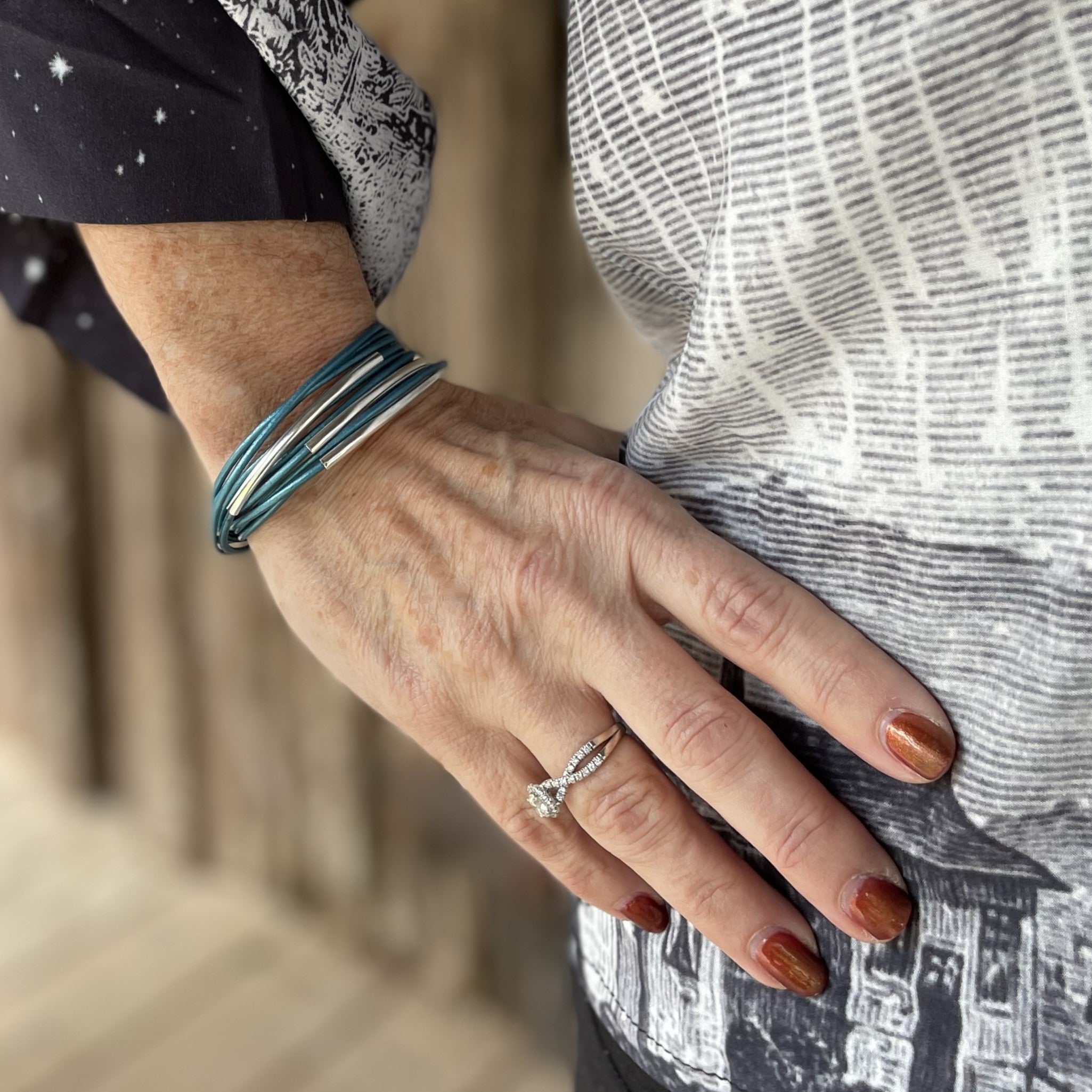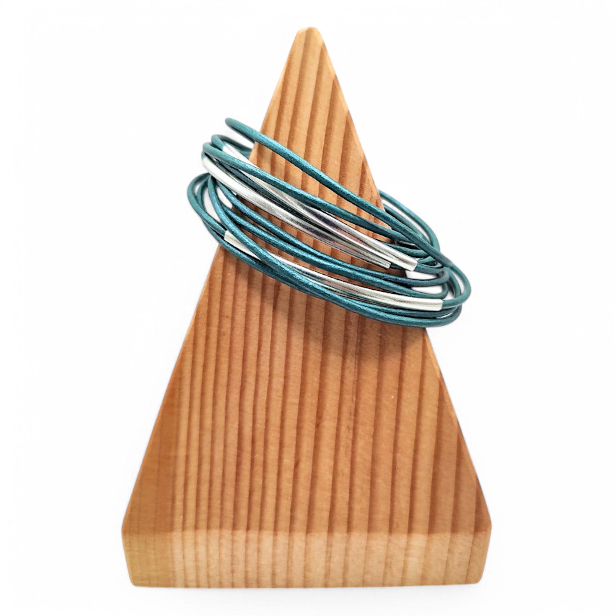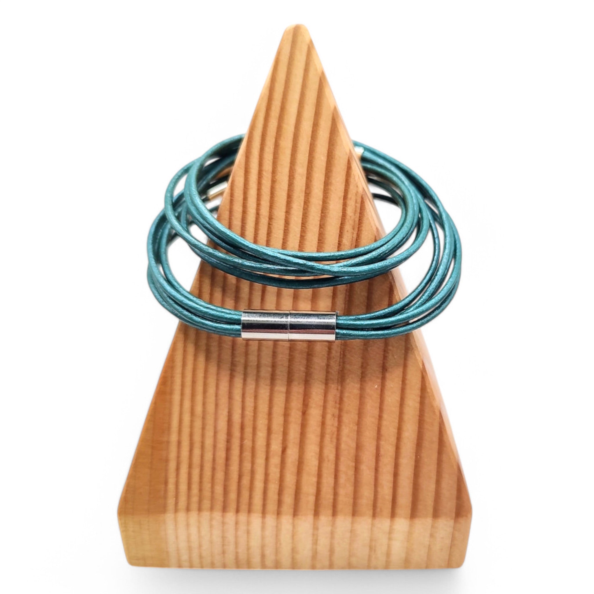 This vibrant turquoise bracelet is made from 2mm leather cord and sleek silver-plated tubes. Five leather cords double-wrap around the wrist, adding a touch of color to any outfit. The strong magnetic clasp makes it effortless to put on and take off. You can even wear it as a single necklace! Perfect for wrists measuring 6.5 to 7 inches.