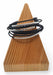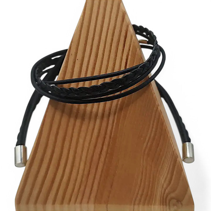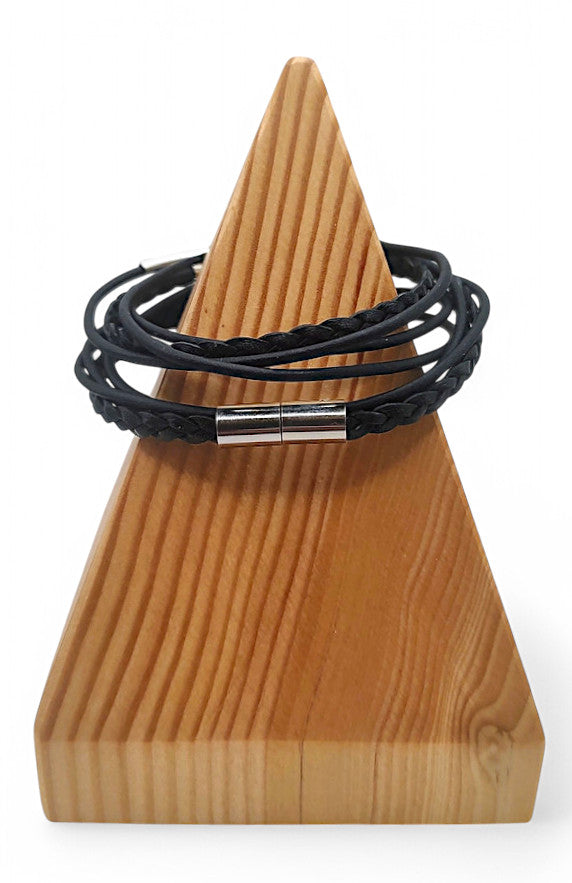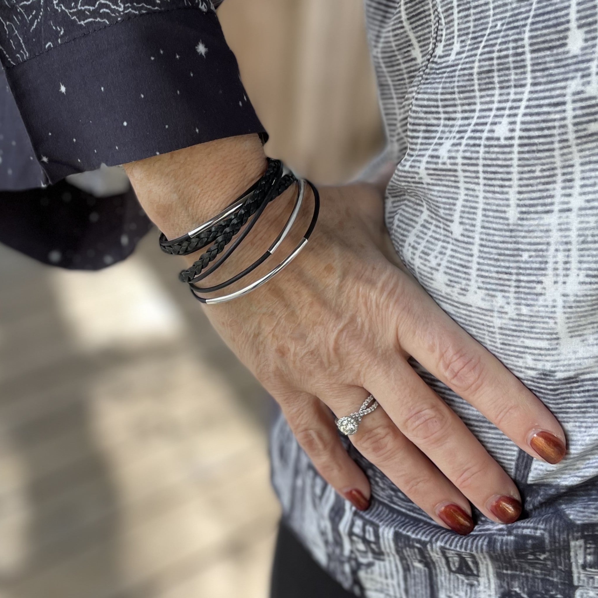 This 100% leather bracelet is crafted with 2mm licorice cord, flat-braided leather, and silver-plated tubes. It features five leather cords that wrap around the wrist twice, creating a multilayered effect.