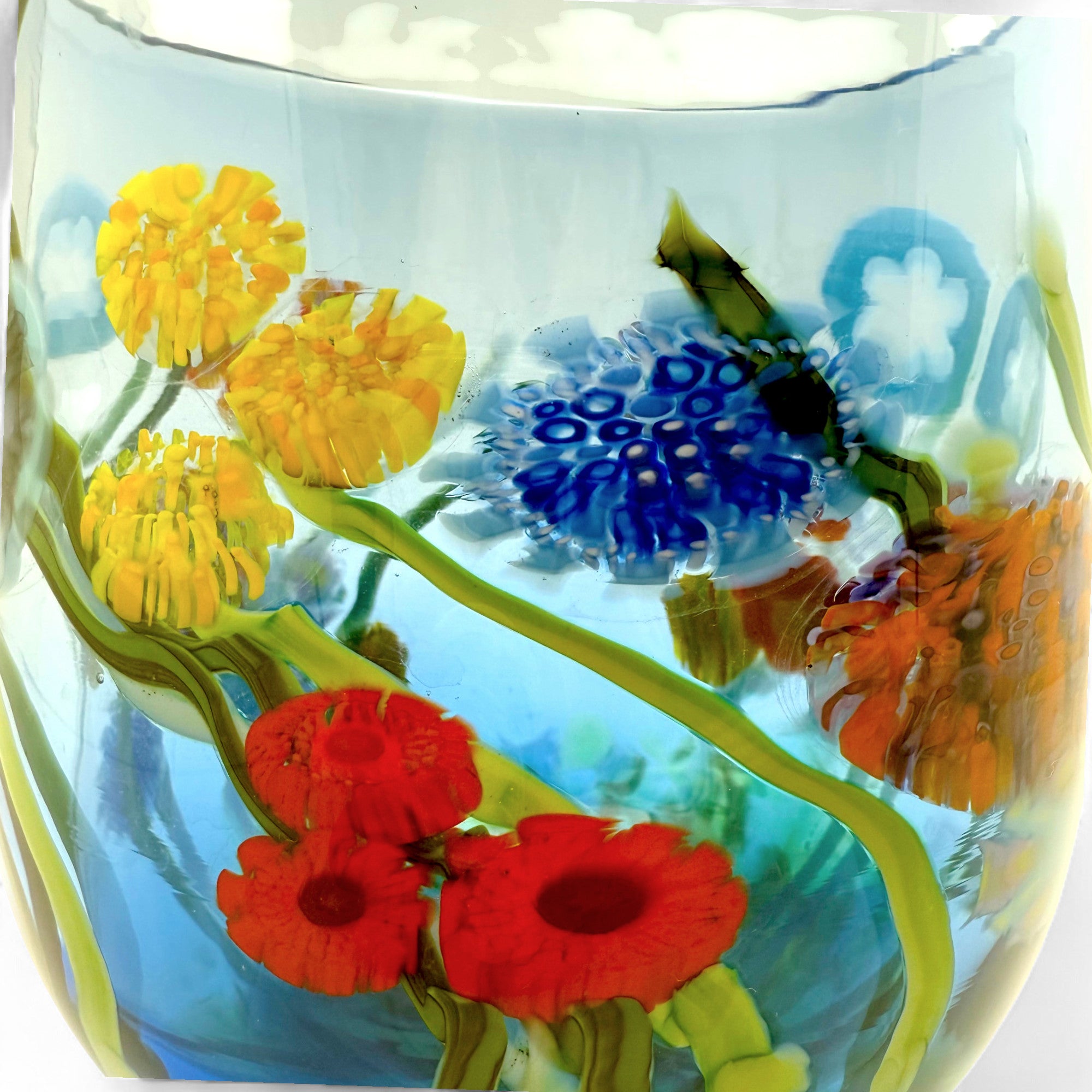 Infuse your space with the charm of this distinctive hand-blown glass vase. A soft blue center anchors the design, while a lively ring of murrine blooms wraps around the form like a floral garland in glass. Layers of color and fine detail give this piece a lively, ever-changing quality—capturing attention from every angle.