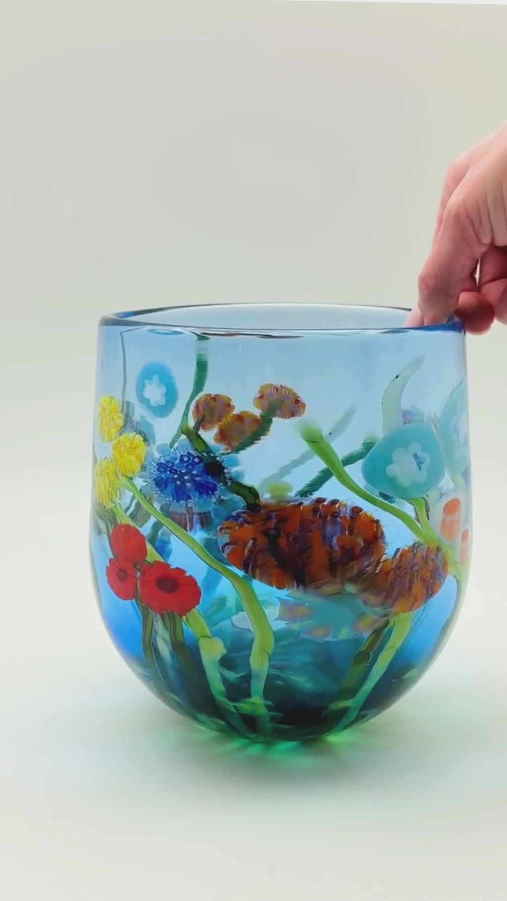 Renowned glass artist Lisa Oakley, with over two decades of expertise in the murrine technique, meticulously crafts each vessel. The process begins with creating handmade murrine canes, which are then sliced into delicate cross-sections, revealing intricate patterns and a mesmerizing fusion of color.