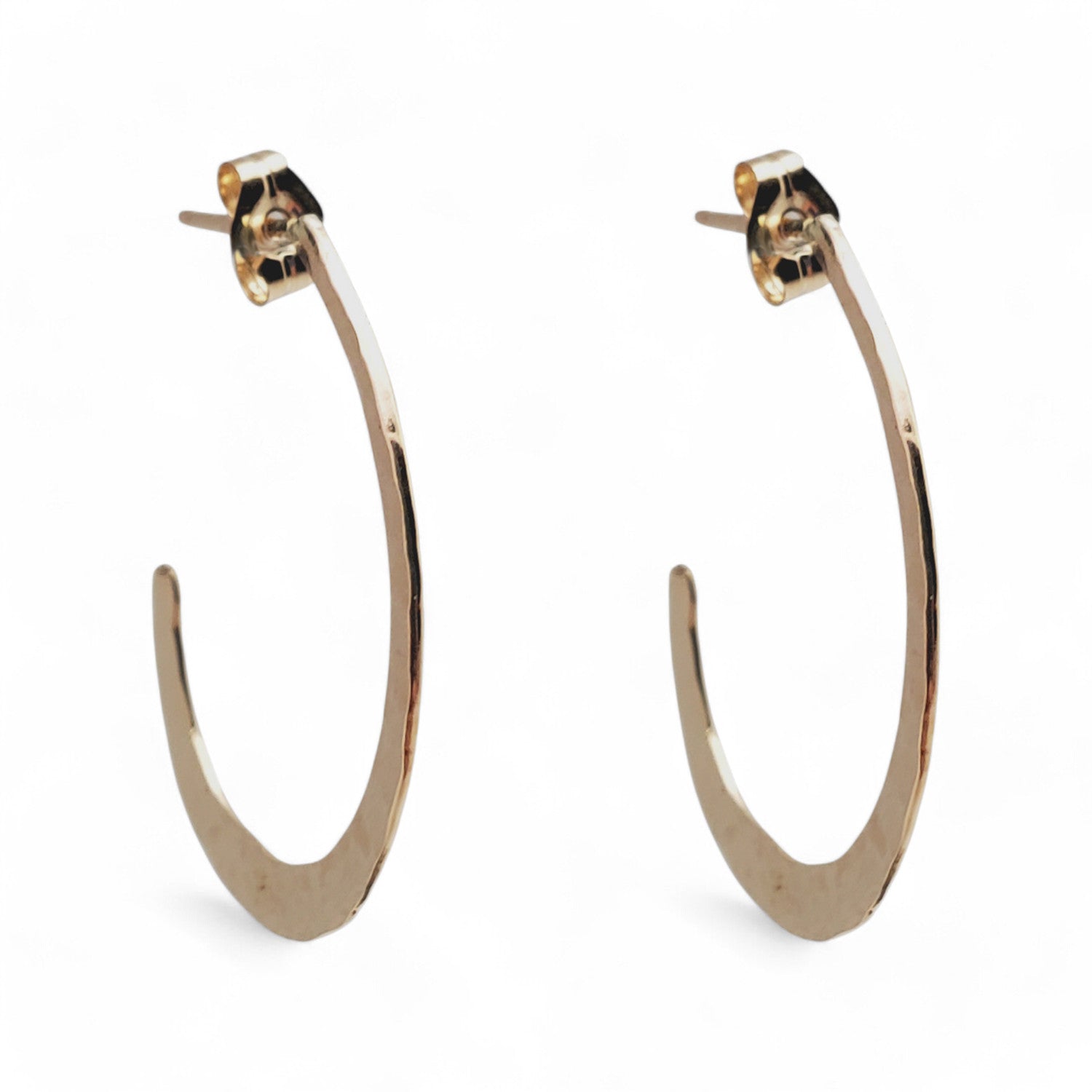 This original design showcases a graceful gold-fill crescent, accented with subtle hand-hammered texture that catches the light beautifully. Each crescent measures approximately 1.25" in length, offering just the right balance of elegance and everyday wearability. Finished with a classic post backing for a secure and comfortable fit, these earrings bring a modern, artisanal touch to any jewelry collection.