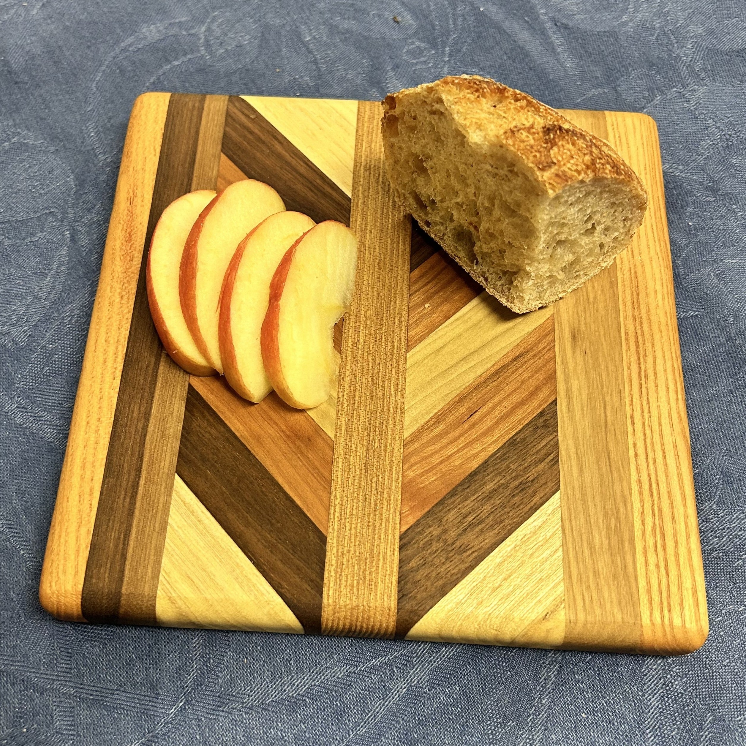 Bring warmth and elegance to your kitchen with this handcrafted chevron cutting board, made from a stunning mix of hardwoods—maple, ash, hickory, white oak, coffenut, tulip poplar, black cherry, black locust, and black walnut. Each board is a unique mosaic of natural color and grain, thoughtfully arranged to create a striking chevron pattern.